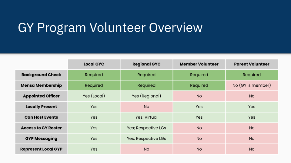Below is a grid of the different GY program volunteer roles along with their limitations and requirements: